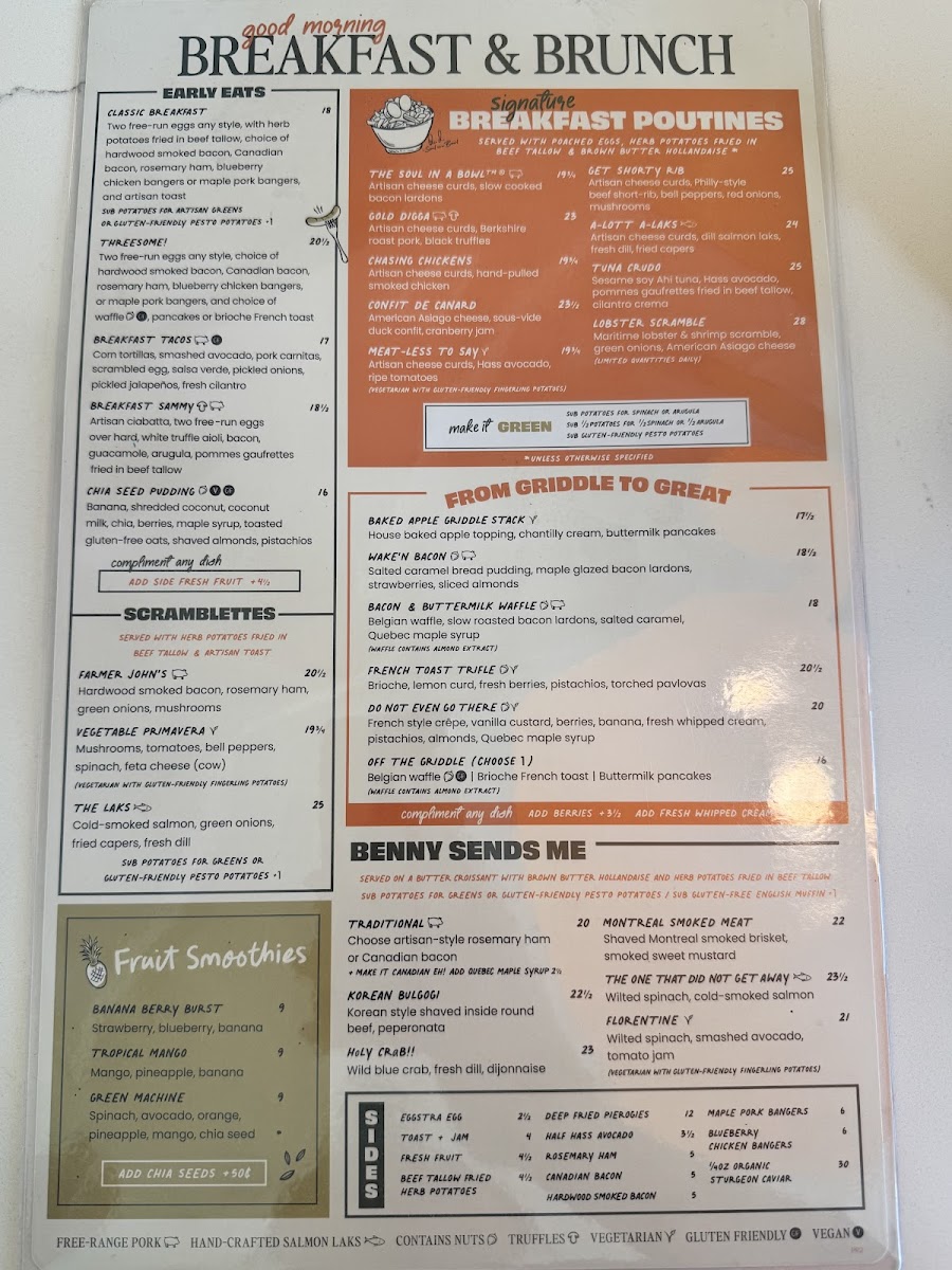 Two free-run eggs any style, with herb potatoes fried in beef tallow, choice of hardwood smoked bacon, Canadian bacon, rosemary ham, blueberry chicken bangers or maple pork bangers, and artisan toast