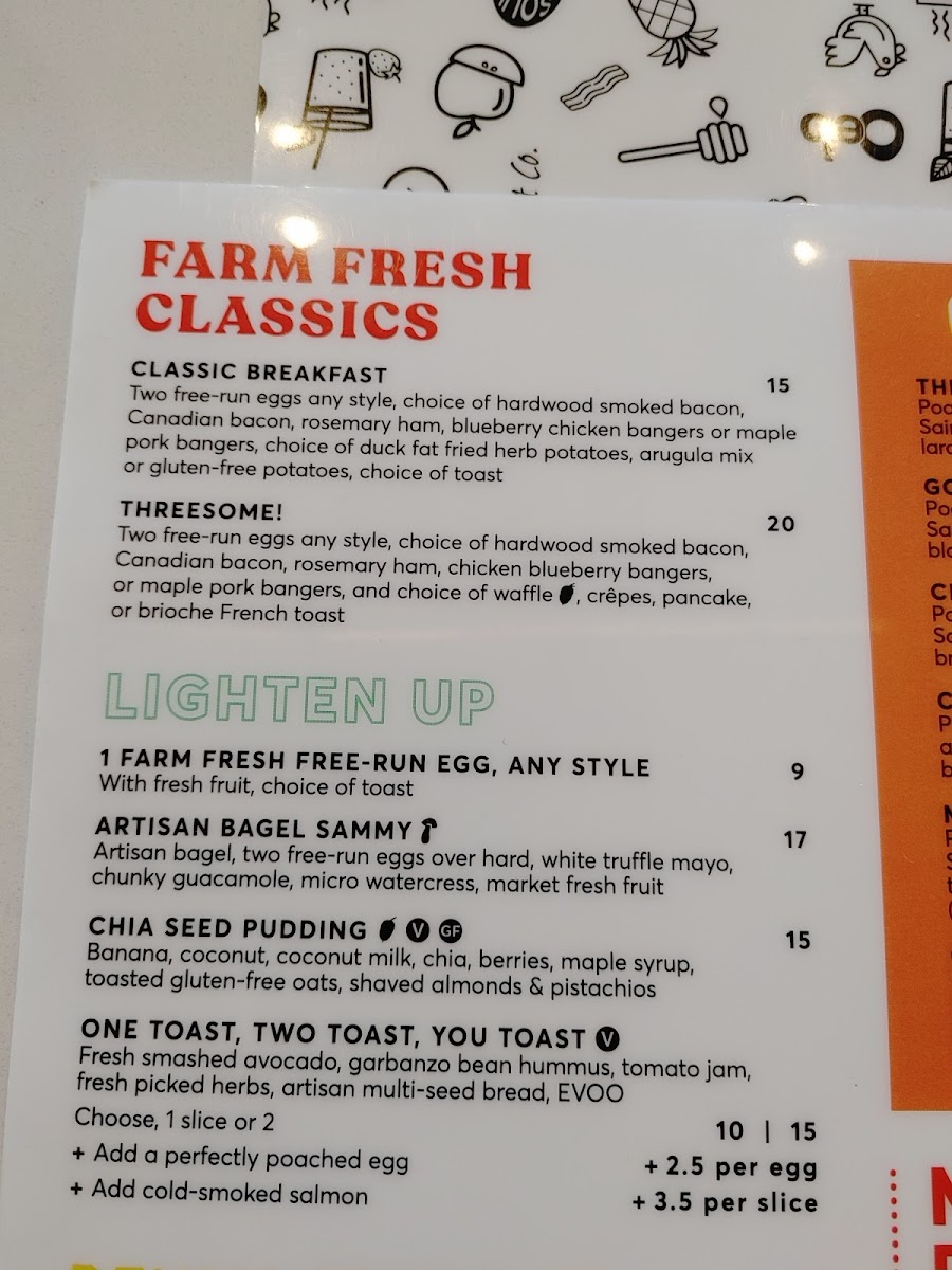 Two free-run eggs any style, choice of hardwood smoked bacon, Canadian bacon, rosemary ham, blueberry chicken bangers, or maple pork bangers, and choice of waffle, pancakes or brioche French toast
